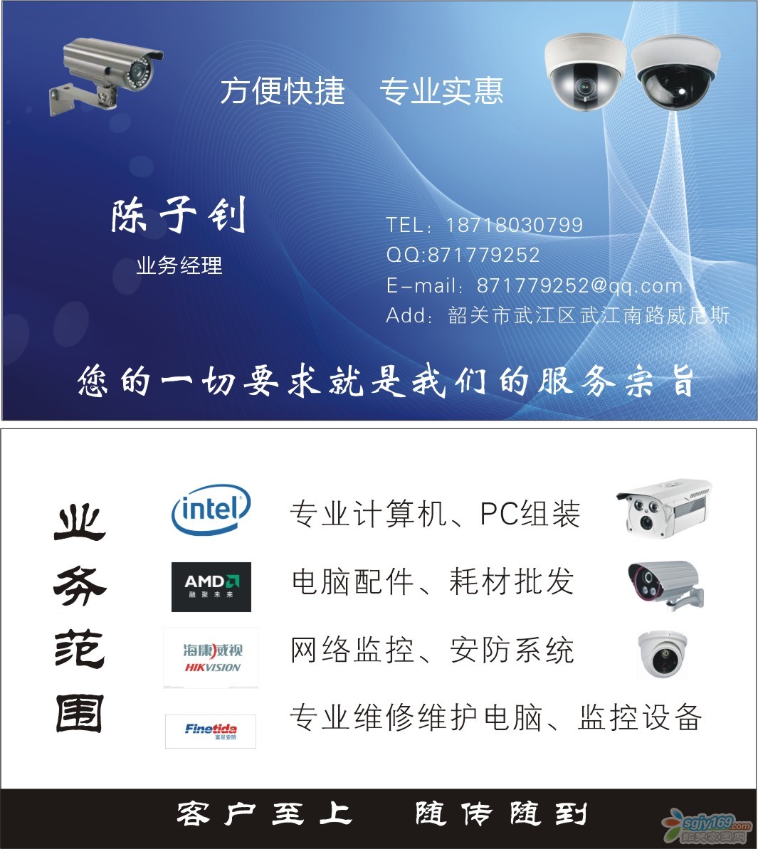 正文摘要:服務(wù)形式:上門維修 服務(wù)口號(hào):客戶至上,隨傳隨到 服務(wù)項(xiàng)目: 上門電腦維修服務(wù),上網(wǎng)故障,電腦慢,死機(jī),更換系統(tǒng),路由器寬帶設(shè)置,無(wú)線WIFI安裝,電腦升級(jí)組裝,監(jiān)控報(bào)裝等等,只需一個(gè)電話幫您 ... |