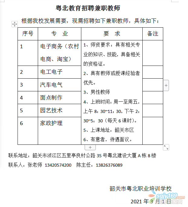 正文摘要:兼職招聘 粵北教育是開展學(xué)歷提升和職業(yè)技能培訓(xùn)、政府、企事業(yè)培訓(xùn)的專業(yè)培訓(xùn)單位。根據(jù)我校發(fā)展需要,現(xiàn)需招聘如下專業(yè)的兼職老師,歡迎有意向的您加入: 招聘:電子商務(wù)(農(nóng)村電商、淘寶)、電子電工、汽車電氣 ... |